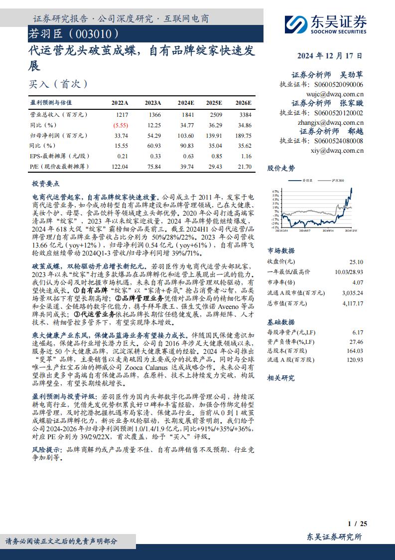 東吳證券-若羽臣-003010-代運營龍頭破繭成蝶,自有品牌綻家快速發(fā)展