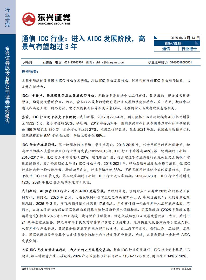 通信IDC行業(yè):進入AIDC發(fā)展階段,高景氣有望超過3年-東興證券