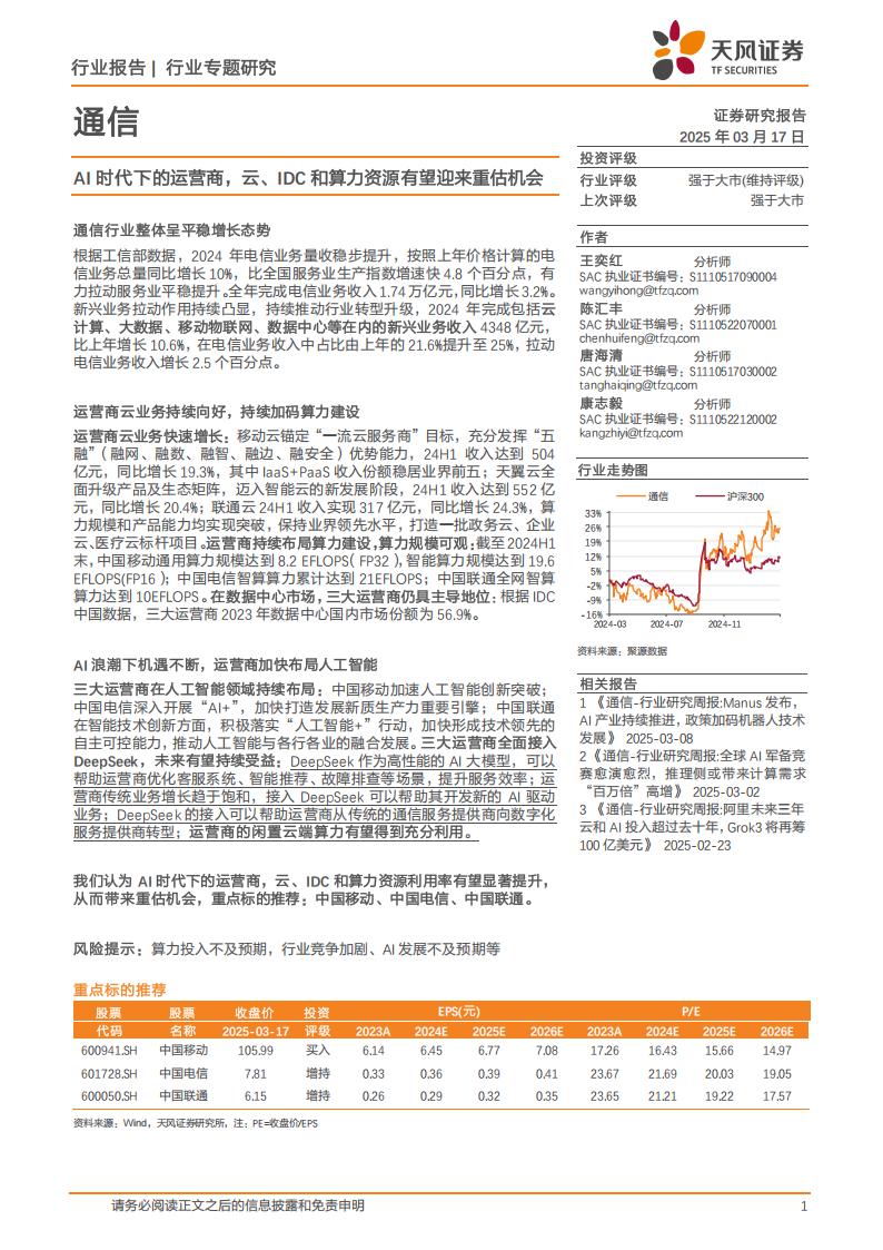 通信行業(yè)專題研究:AI時代下的運營商,云、IDC和算力資源有望迎來重估機會-天風(fēng)證券