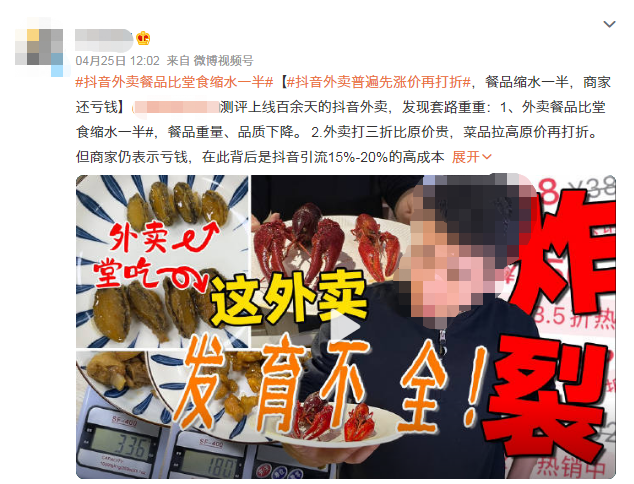 但是,也有的抖音外賣被爆料跟食堂的縮水。據說“外賣打三折比原價貴,菜品拉高原價再打折。但商家仍表示虧錢,在此背后是抖音引流15%-20%的高成本,以及為配合引流的隱性成本”。如果是犧牲體驗為代價,確實不太能穩住用戶心智。