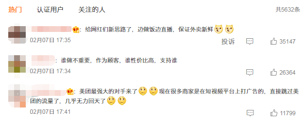 消費者們了解到抖音做外賣,直接給予博主們直播內容的新思路,比如“邊做飯邊直播”保證外賣新鮮。