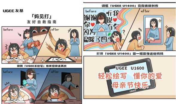 漫畫的可愛簡潔風格,也是可以容納更多信息母親節表達方式,尤其是年輕人主宰的消費市場,不喜歡過于煽情,帶有一些搞怪元素又能體現深刻寓意引人入勝的情節也是這個母親節的新姿勢。