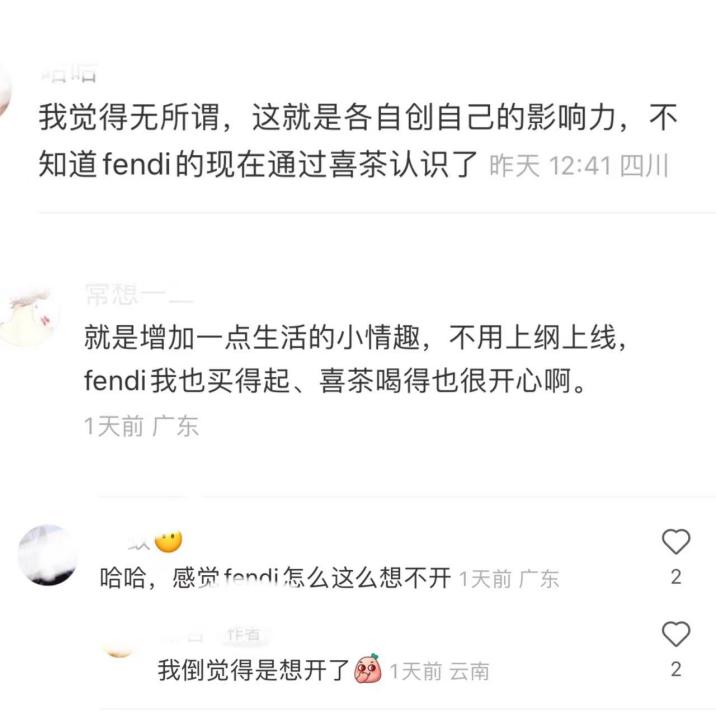 喜茶品牌單獨在茶飲路線上的大眾化認知已經深入人心,但是在聯名這件事情上確實用力過多了,聯名跨界是一個快速鏈接年輕群體的方式,但是頻繁聯名,賺取的只是一時的熱度,當沒有熱度的時候,流量也就下降了。對于Fendi來說,雖然滿足了部分消費者的虛榮心以及增加了受眾認知面,但是這次聯名遭受群嘲的聲音比較多,也是該思考一下聯名的作用了。