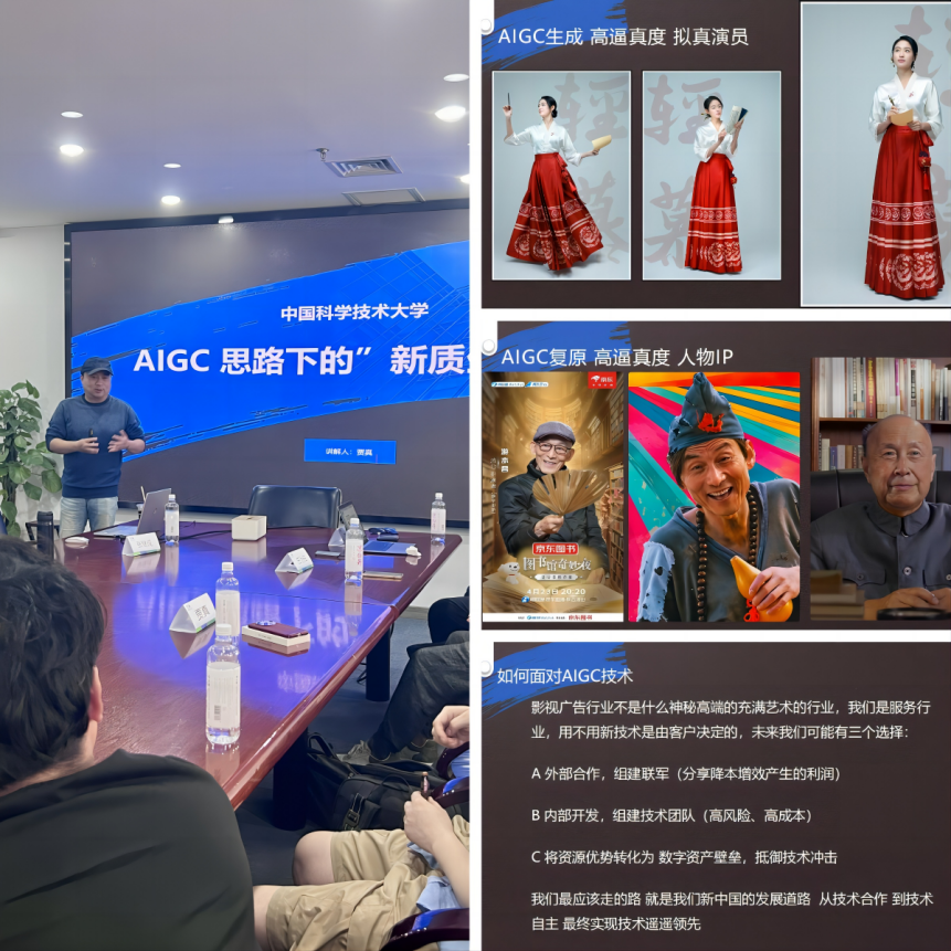 中國科技大學控股校企合伙人&CEO賈真做《AIGC思路下的“新質(zhì)生產(chǎn)力”》主題分享。他曾經(jīng)是影視廣告制作行業(yè)的老兵,疫情期間苦心鉆研AI數(shù)字人技術,成功轉型為AIGC實踐家。為大家現(xiàn)場展示了AIGC生成的伊利輕慕數(shù)字代言人、AIGC復原的數(shù)字錢學森和數(shù)字濟公等數(shù)字資產(chǎn)成果,AIGC變革的發(fā)展方向以及最新的應用技術。