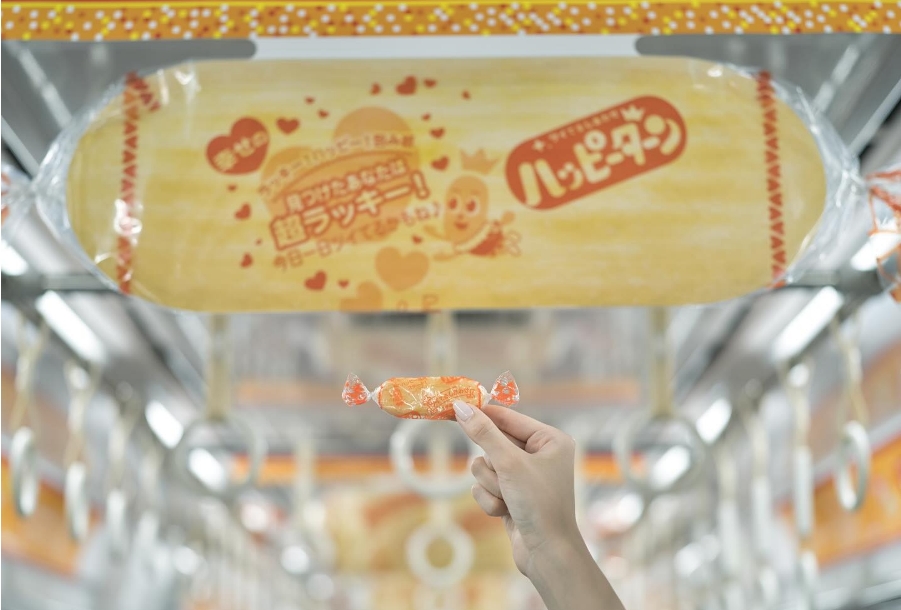 日本地鐵掛了超大的米餅,無疑成為上班族勾起饑餓感的視覺沖擊。這種異形廣告通過在特定場景中進行“形狀”和“空間”的創新,吸引消費者的關注。