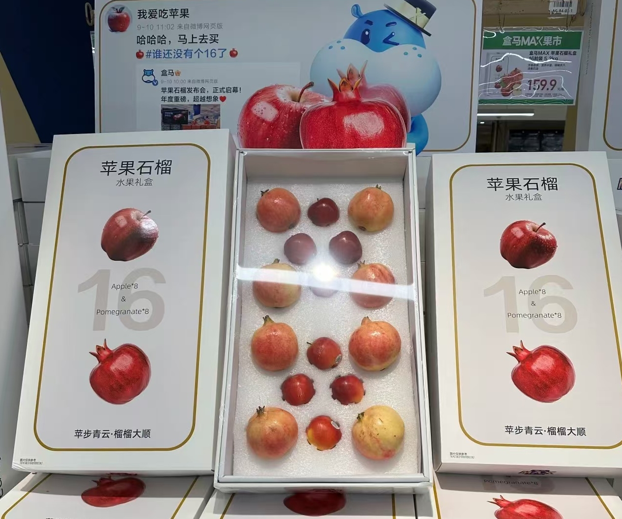“輕量化”廣告還是一種話題制造營銷形式。在今年Apple盛大推出其最新力作iPhone16之際,盒馬也不失時機地揭曉了自家的創意新品——“果界新星:蘋果16”(寓意豐富的蘋果石榴)。這款產品的包裝簡約而不失格調,僅僅“蘋果石榴”四字,便巧妙捕捉了所有人的遐想。于包裝一角細膩地標注了英文名稱,并巧妙融入數字元素,營造出一種既真實又略帶戲謔的“真假Apple”氛圍。