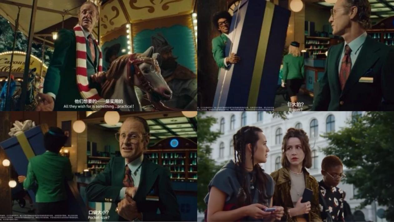 三星在圣誕廣告中,選擇了一位“紳士”作為主角,帶領(lǐng)觀眾走進溫馨的禮品店,展示三星的折疊手機、藍(lán)牙耳機和智能手表。雖然廣告通過場景化敘事和夸張對比,將三星產(chǎn)品與其他禮品進行對比,意在突出產(chǎn)品的獨特性,但實際上卻過度聚焦于產(chǎn)品的外在優(yōu)勢,而忽略了節(jié)日的情感聯(lián)系。三星在廣告中強調(diào)便攜性和實用性,但對消費者在節(jié)日期間渴望的情感表達(dá)顯得欠缺。整個廣告顯得冷淡且缺乏共鳴,觀眾在看過后更多記住的是產(chǎn)品功能,而不是圣誕的溫情和關(guān)懷,這樣的形式大于內(nèi)容的表現(xiàn)方式未能建立起與觀眾的深層次情感聯(lián)系。