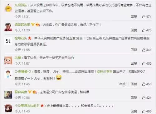 神州專車曾在微博上發布了一系列吳秀波、海清等公眾人物打出“beat u!我怕黑專車”口號的海報,被認為矛頭直指打車軟件uber不安全,以黑車之實令用戶承擔風險,并批評其服務不周全、投訴無門等.