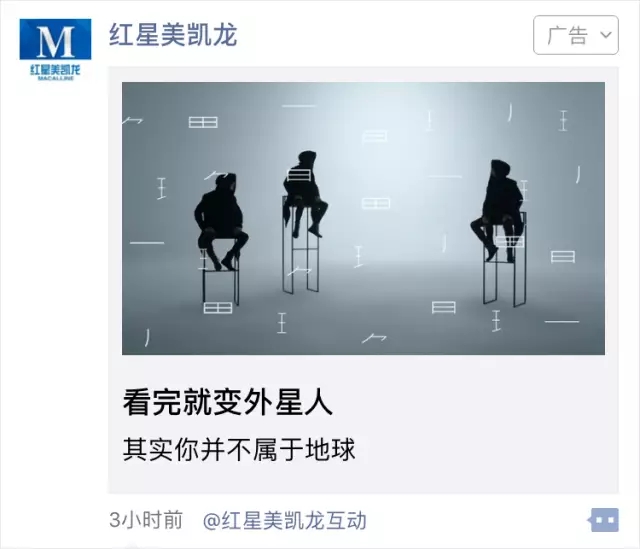 9月剛開始,紅星美凱龍在朋友圈投放了這樣一個懸念廣告《看完就變外星人》。這則廣告作為今年紅星美凱龍魯班設計尖貨節的開幕廣告。廣告中穿黑衣的魯班娓娓道來自己是第一個外星人。奇妙瑰麗的畫面,展現了一段魯班外星人的獨白,引發消費者好奇心,直到最后才揭曉答案。這則廣告也引起了消費者的自發傳播。紛紛留言互動。這支廣告不僅是對此次跨界盛典的預熱,也是活動精神理念的傳遞。