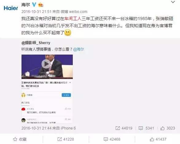 趁社交熱點,除了老司機杜蕾斯,可能就算海爾了。首富王健林在萬達學院開學典禮上,說當時一個項目賠了10億多比海爾砸冰箱偉大多了。馬上,海爾官微回應。隨后,近1000家品牌跟風煽風點火,站隊力挺海爾。比如:360、網易、聯想、哇哈哈、滴滴、讀者、三全、意爾康、美團、小米、康師傅、華碩等官微···