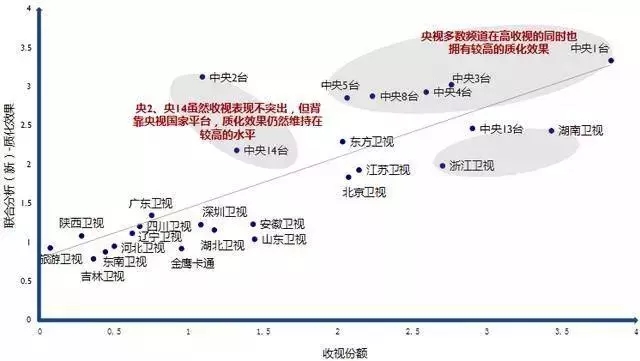 電視劇資源被一線頭部衛視壟斷是不爭的事實力。根據衛視收視率與質化效果分析顯示,除中央臺背靠國家擁有高收視高質化之外,一線五家衛視(湖南衛視、浙江衛視、東方衛視、江蘇衛視、北京衛視)表現突出。