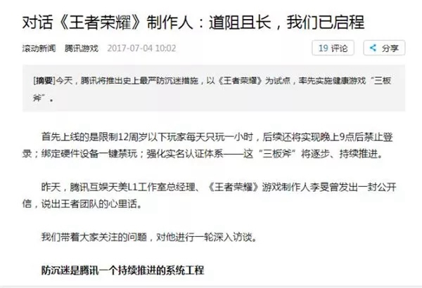 立即啟動“防沉迷”系統,防止未成年人沉迷游戲。騰訊官方微信再次發文《對話王者榮耀制作人:道阻且長,我們已啟程》,指出已啟動防沉迷措施,并疑似側面回應人民網的質疑。