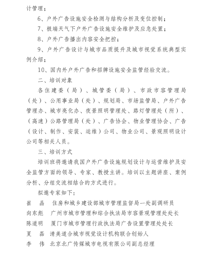 關于舉辦全國戶外廣告設施規劃設計與運營維護及安全監管培訓班的通知