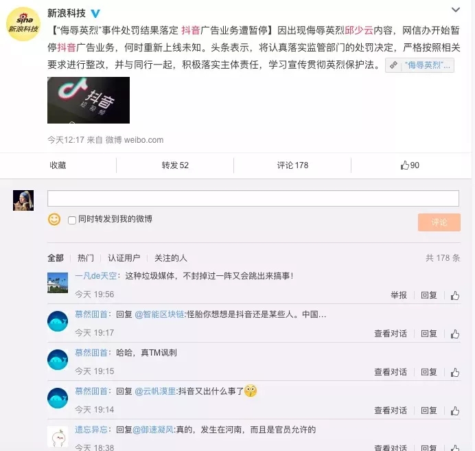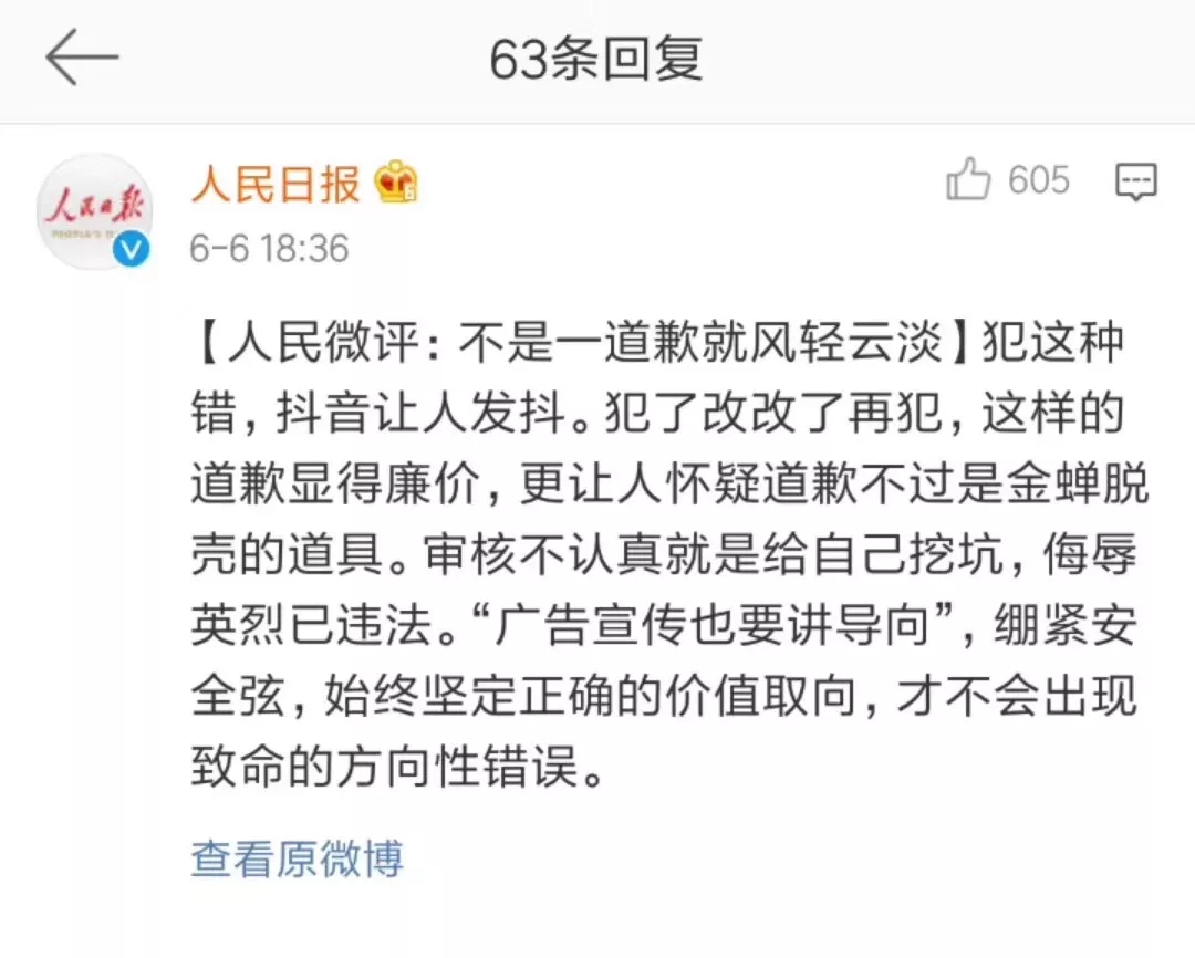 今日頭條就搜索引擎廣告投放中出現(xiàn)對英烈不敬的內(nèi)容,向大家致歉。隨后人民日報發(fā)表評論:不是一道歉就風輕云淡。犯這種錯,抖音讓人發(fā)抖。犯了改改了再犯,這樣的道歉顯得廉價,更讓人懷疑道歉不過是金蟬脫殼的道具。