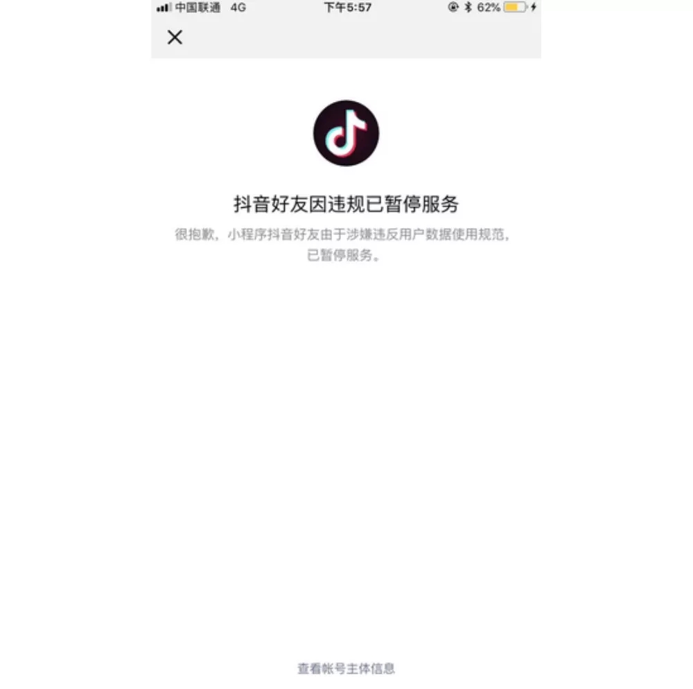7月4號,抖音官方小程序“抖音好友”需要用戶授權才可以登陸。用戶可利用此小程序查看群中使用抖音的好友。稍后,該小程序因“涉嫌違反用戶數(shù)據(jù)使用規(guī)范”暫停服務。